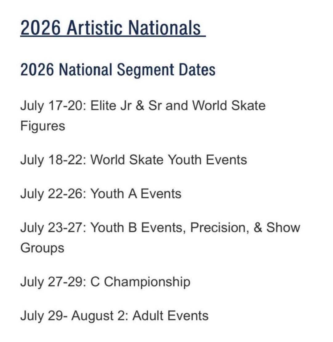 July 17 -August 2, 2026 – USA Roller Sports National Figure Championship in Lincoln, NB at the Speedway Sports Complex – Entries Due with 2026 Regional Results.